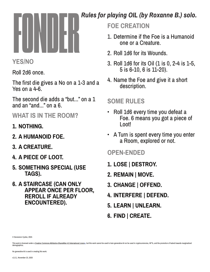 The supplement provides rules for playing OIL solo, including yes/no and open-ended oracles as well as room oracles, rules for creating Foes, and rules clarifications.