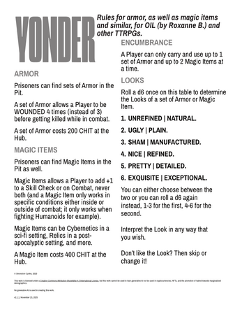 YONDER is a supplement for Roxanne B's OIL (but it can be used in any other TTRPG with wounds, 2d6 rolls, and currencies, just replace Chits with something more appropriate to your game and/or setting). It is v2.0.0 (now v2.1.1) of GO BEYOND YOU, which is a supplement for Spear Witch's What's So Cool About Outer Space, made for the What Is So Cool About Jam.